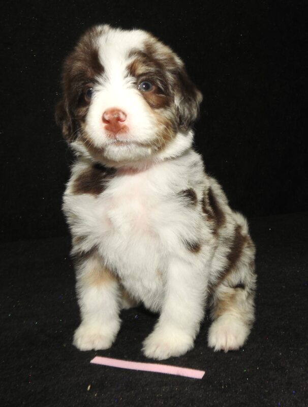 Aspen is an F1 Bernedoodle weighing in at 65#. She has a very easy going with a sweet disposition. She is very intelligent and will produce Tri color F1b Bernedoodles and Merle Tri color F1b Bernedoodles depending on which stud she is bred to. Look for her pups to sell out Fast!!!