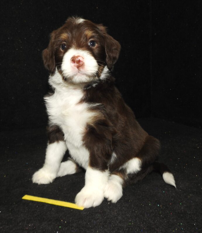 Aspen is an F1 Bernedoodle weighing in at 65#. She has a very easy going with a sweet disposition. She is very intelligent and will produce Tri color F1b Bernedoodles and Merle Tri color F1b Bernedoodles depending on which stud she is bred to. Look for her pups to sell out Fast!!!