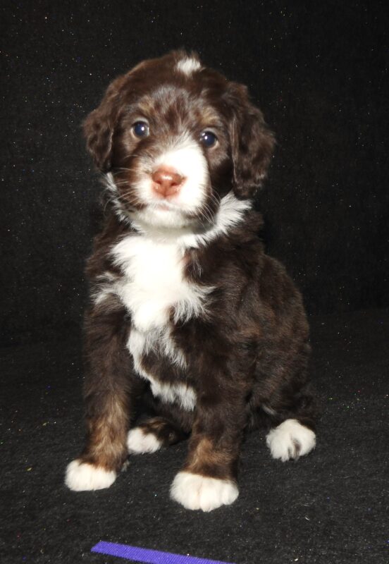 Aspen is an F1 Bernedoodle weighing in at 65#. She has a very easy going with a sweet disposition. She is very intelligent and will produce Tri color F1b Bernedoodles and Merle Tri color F1b Bernedoodles depending on which stud she is bred to. Look for her pups to sell out Fast!!!