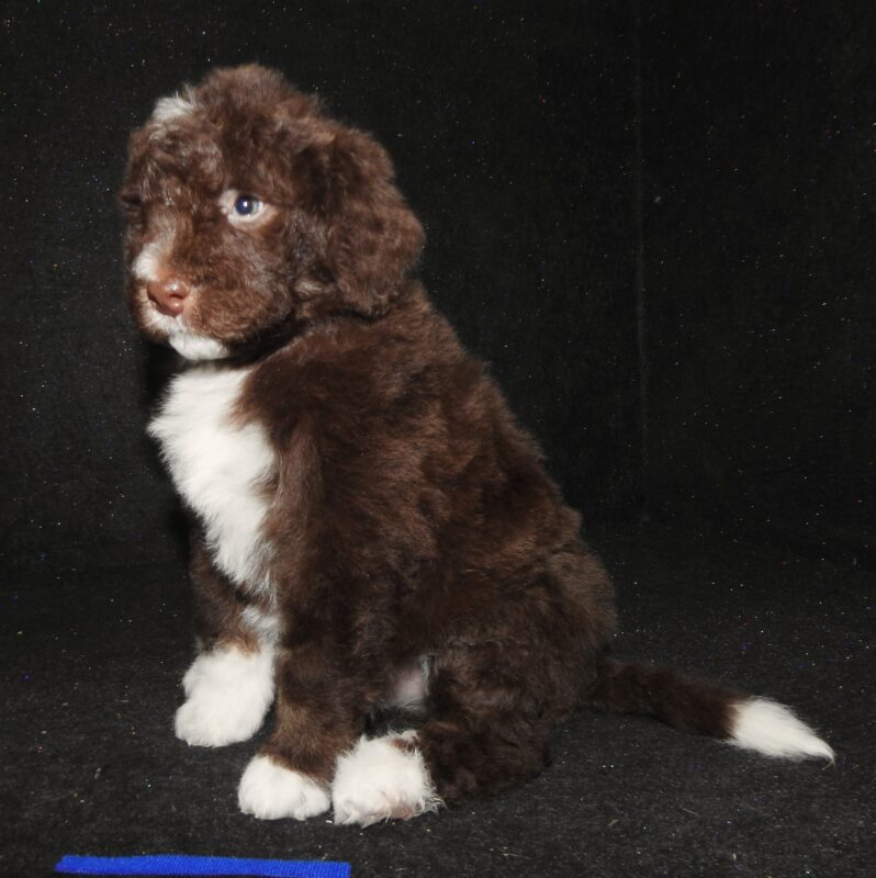 Aspen is an F1 Bernedoodle weighing in at 65#. She has a very easy going with a sweet disposition. She is very intelligent and will produce Tri color F1b Bernedoodles and Merle Tri color F1b Bernedoodles depending on which stud she is bred to. Look for her pups to sell out Fast!!!
