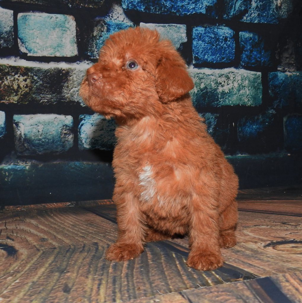 She is party factored and out of a Akc yellow Lab female and a Chocolate and white Party colored male Standard Poodle! She weighs 55# and is a retrieving nut also!! She loves the water. Check out her previous pups on our facebook link under the photo section! She has been producing mostly chocolate pups with a few party colored pups and an occassional light colored pup! pups have been curly coated to semi -curly fleece type coats all receiving excellent reviews!! Look for her pups to sell out fast she has been very popular!