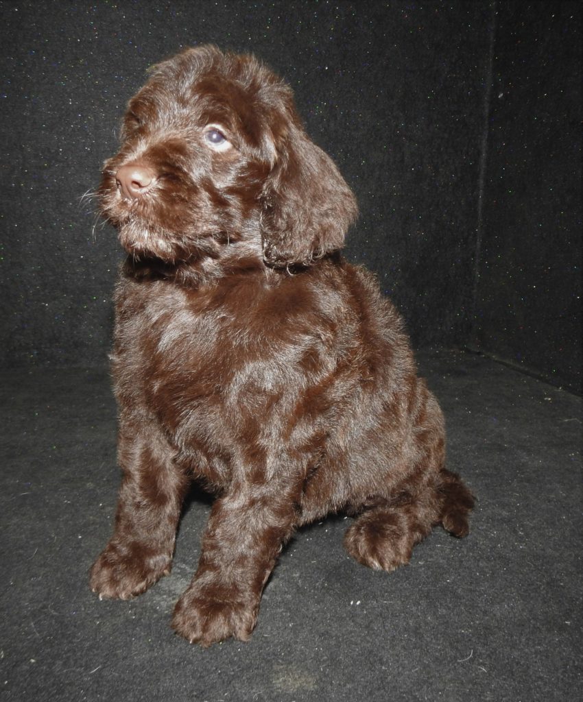 Cocoa is an F1 American Goldendoodle and I have added her to are program for her rare color(Chocolate) as time progresses you will see more color phases of Goldendoodles courtesy of the broad color base the Poodles offer. these colors are going to absolutely stunning. We will be able to offer Brown-White and Black – White party colored, Chocolate with white toes-chest, Black with white toes-chest, and solid Chocolates and Blacks, these color phases are going to gorgeous!! Couple the color with her stunning personality and her solid conformation and watch out!! – Show stoppers for sure!! Cocoa weighs in at 72#.