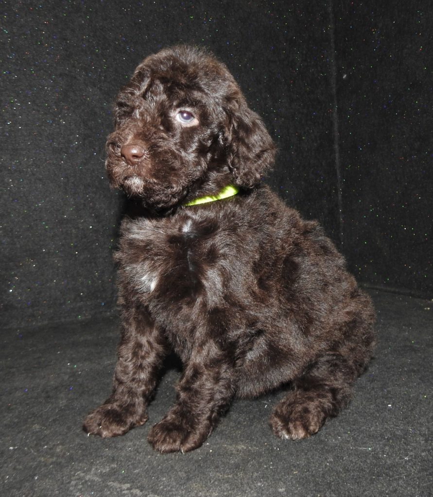Cocoa is an F1 American Goldendoodle and I have added her to are program for her rare color(Chocolate) as time progresses you will see more color phases of Goldendoodles courtesy of the broad color base the Poodles offer. these colors are going to absolutely stunning. We will be able to offer Brown-White and Black – White party colored, Chocolate with white toes-chest, Black with white toes-chest, and solid Chocolates and Blacks, these color phases are going to gorgeous!! Couple the color with her stunning personality and her solid conformation and watch out!! – Show stoppers for sure!! Cocoa weighs in at 72#.