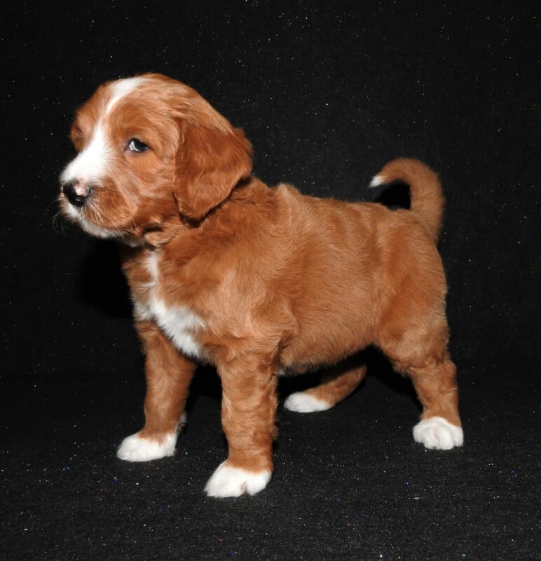 Ginger is a F1 American goldendoodle that we are very excited about!! She will produce F1b non shedding goldendoodles. She is parti-factored and has 4 white socks & chest which should make for very nicely marked puppies. She has an awesome, easy going temperament, highly intelligent, so look for her puppies to be very quick to train and eyecatchers when out in the public. She weighs approx 47 lbs.
