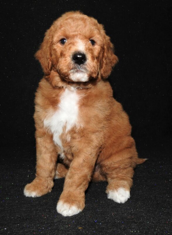 Ginger is a F1 American goldendoodle that we are very excited about!! She will produce F1b non shedding goldendoodles. She is parti-factored and has 4 white socks & chest which should make for very nicely marked puppies. She has an awesome, easy going temperament, highly intelligent, so look for her puppies to be very quick to train and eyecatchers when out in the public. She weighs approx 47 lbs.