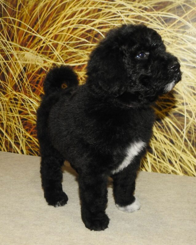 and a black & white party colored standard poodle with lots of freckling. He is highly intelligent, weighs in at 70# and has a very easy going