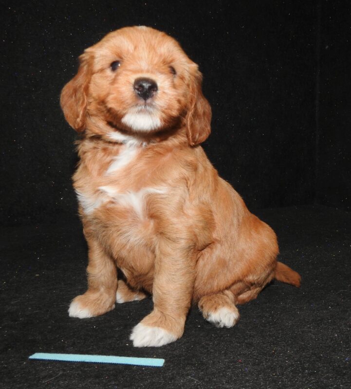 Tucker is an AKC Miniature poodle stud that we are excited about. He sports a Dark Red color with the white socks and chest making him a very sharp looking stud which when bred to select females in our program will create some very awesome looking Goldendoodles and Labradoodles. He is a lover and charms everyone he meets Look for his pups to be highly intelligent, very friendly and be prepared for his pups to draw a lot of attention when out on walks. If your looking for a smaller power packed package take a hard look at Tucker’s pups. Tucker weighs 13#