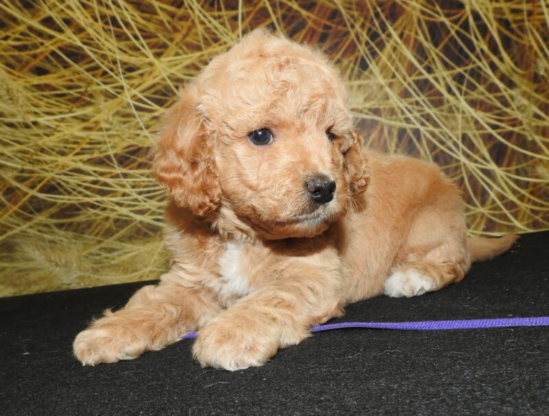 Tucker is an AKC Miniature poodle stud that we are excited about. He sports a Dark Red color with the white socks and chest making him a very sharp looking stud which when bred to select females in our program will create some very awesome looking Goldendoodles and Labradoodles. He is a lover and charms everyone he meets Look for his pups to be highly intelligent, very friendly and be prepared for his pups to draw a lot of attention when out on walks. If your looking for a smaller power packed package take a hard look at Tucker’s pups. Tucker weighs 13#