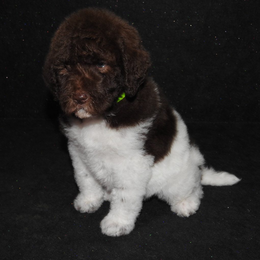 Jersey is a party colored (chocolate/white mix) F1b Labradoodle with a very soft curly fleece coat! She weighs aprox. 55# . She stays in the house and is a very intelligent dog with a very easy going disposition. She loves to swim and retrieve! She does not shed at all! Look for her pups to be very quick witted and eyecatchers for sure!!