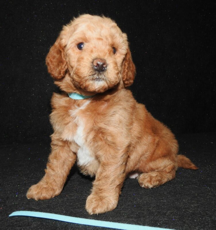 Tucker is an AKC Miniature poodle stud that we are excited about. He sports a Dark Red color with the white socks and chest making him a very sharp looking stud which when bred to select females in our program will create some very awesome looking Goldendoodles and Labradoodles. He is a lover and charms everyone he meets Look for his pups to be highly intelligent, very friendly and be prepared for his pups to draw a lot of attention when out on walks. If your looking for a smaller power packed package take a hard look at Tucker’s pups. Tucker weighs 13#