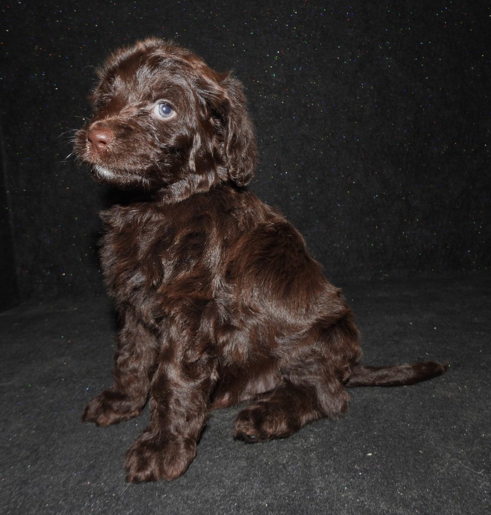 Beautiful Australian Labradoodle chocolate and chocolate and white party colored labradoodles bred to have low to non-shedding fleece type coats.  These pups should mature out at 35-45# females and 45-55# males.Maggie is out of  2 of are outstanding dogs with great reputations for health, teperment, and intelligence. Brandy and Remington are her Stud and Dam!  These should be awesome pups that are quick to learn and eye catchers for sure!  Reserve your puppy today with a $200.00 deposit and a puppy application!!