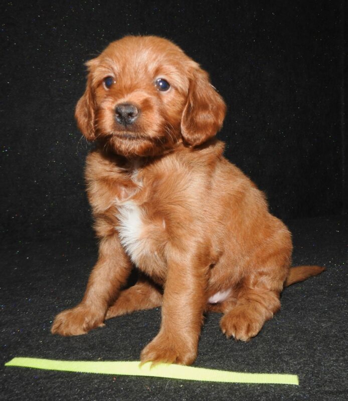 Tucker is an AKC Miniature poodle stud that we are excited about. He sports a Dark Red color with the white socks and chest making him a very sharp looking stud which when bred to select females in our program will create some very awesome looking Goldendoodles and Labradoodles. He is a lover and charms everyone he meets Look for his pups to be highly intelligent, very friendly and be prepared for his pups to draw a lot of attention when out on walks. If your looking for a smaller power packed package take a hard look at Tucker’s pups. Tucker weighs 13#