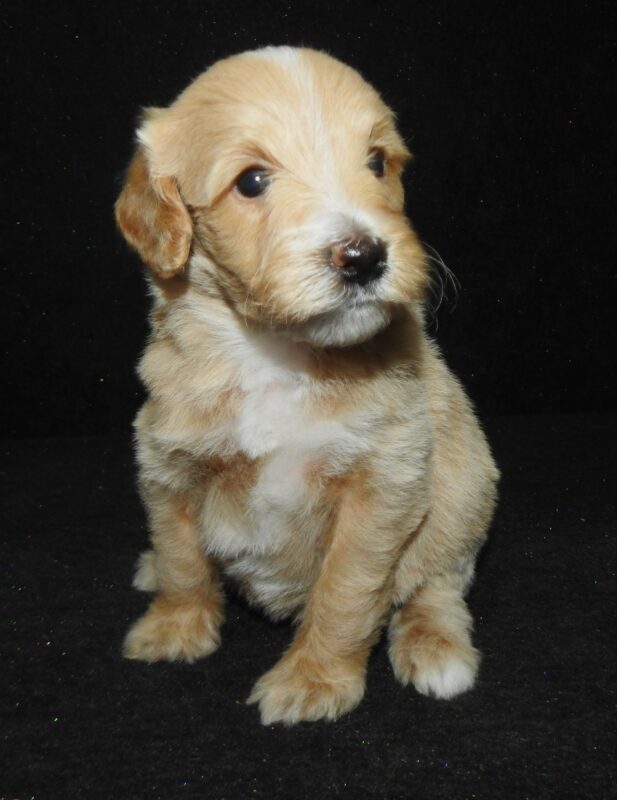 Meadow is an F1 American Goldendoodle that will produce red/Honey or apricot colored puppies with white socks and chest when bred to the right male. Her puppies will be F1b American goldendoodles. Meadow is very outgoing and sports a great coat. She has an awesome temperament and very intelligent. Look for her puppies to be show stoppers and drawl a lot of attention when out in public. Meadow weighs 58#