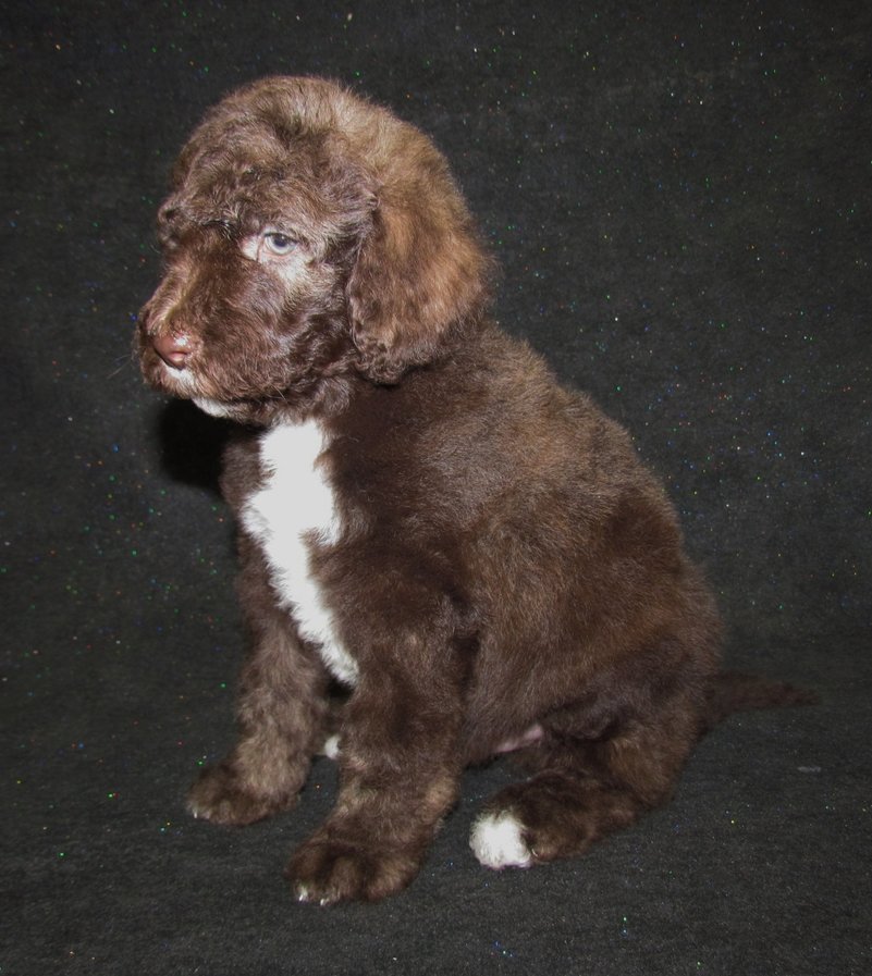 Beautiful Australian Labradoodle chocolate and chocolate and white party colored labradoodles bred to have low to non-shedding fleece type coats.  These pups should mature out at 35-45# females and 45-55# males.Maggie is out of  2 of are outstanding dogs with great reputations for health, teperment, and intelligence. Brandy and Remington are her Stud and Dam!  These should be awesome pups that are quick to learn and eye catchers for sure!  Reserve your puppy today with a $200.00 deposit and a puppy application!!