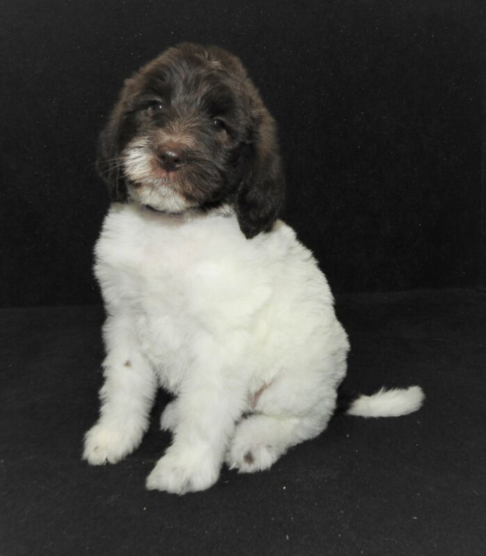 Boone is an Australian Labradoolde weighing in at 32# and has a curly fleece style coat. Boone comes to us from an Australian Labradoodle breeder that is very reputable. He carries the party gene and can produce party colored pups, or chocolate pups with white accents! Look for his pups to be very intelligent and fast to train.