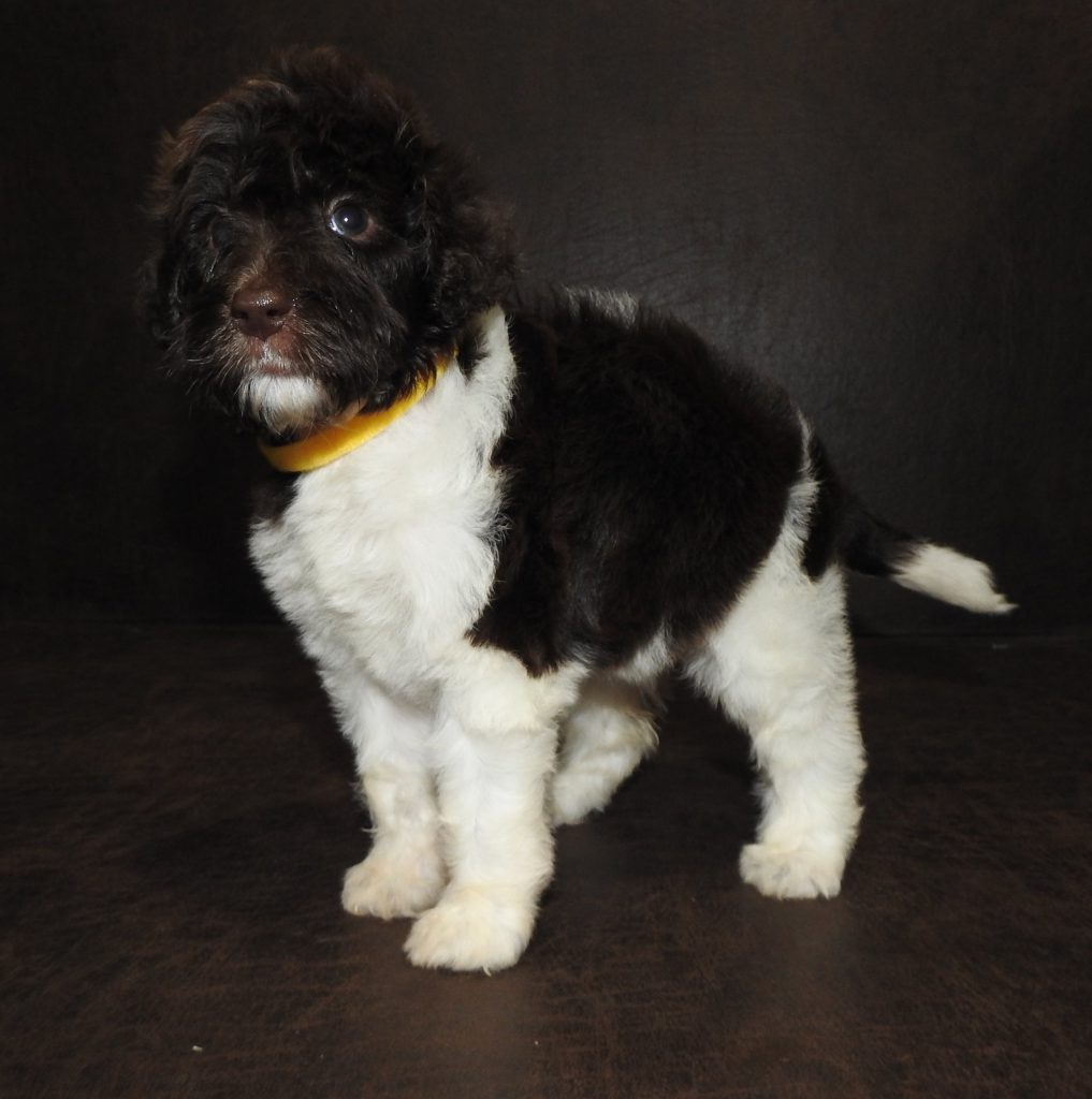 First of all these are temporary pictures until her fall photo shoot!!! We are very excited to add Panda to are Goldendoodle Program. Panda is out of a AKC Brown and white Standard Poodle female and a white creme AKC English Golden Retriever and carries the party gene! She weighs in at aprox. 70 # and has a very soft easy going temperment. Look for her to produce some very high quality F1b non-shedding goldendoodles with flowing black wavy to curly coats with white markings on the chest and toes possible. She is very intelligent and has alot to offer in our breeding program. Look for her puppies to be eyecatchers for sure!!!