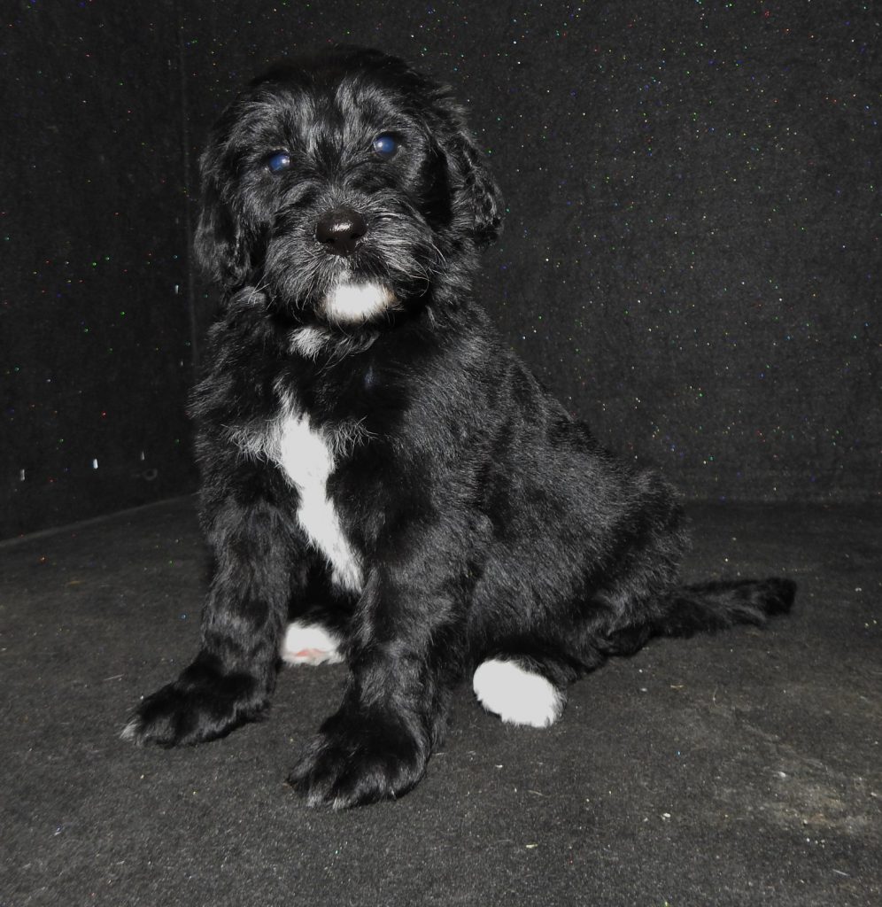First of all these are temporary pictures until her fall photo shoot!!! We are very excited to add Panda to are Goldendoodle Program. Panda is out of a AKC Brown and white Standard Poodle female and a white creme AKC English Golden Retriever and carries the party gene! She weighs in at aprox. 70 # and has a very soft easy going temperment. Look for her to produce some very high quality F1b non-shedding goldendoodles with flowing black wavy to curly coats with white markings on the chest and toes possible. She is very intelligent and has alot to offer in our breeding program. Look for her puppies to be eyecatchers for sure!!!