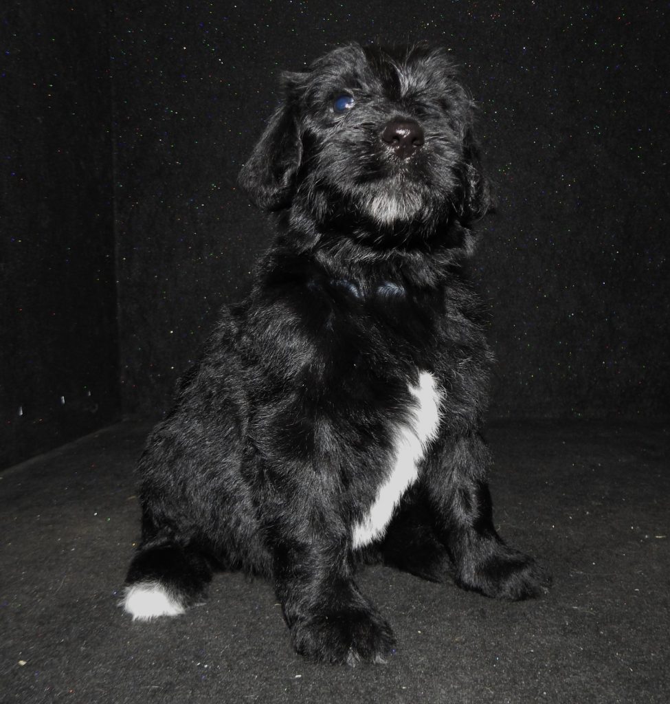 First of all these are temporary pictures until her fall photo shoot!!! We are very excited to add Panda to are Goldendoodle Program. Panda is out of a AKC Brown and white Standard Poodle female and a white creme AKC English Golden Retriever and carries the party gene! She weighs in at aprox. 70 # and has a very soft easy going temperment. Look for her to produce some very high quality F1b non-shedding goldendoodles with flowing black wavy to curly coats with white markings on the chest and toes possible. She is very intelligent and has alot to offer in our breeding program. Look for her puppies to be eyecatchers for sure!!!
