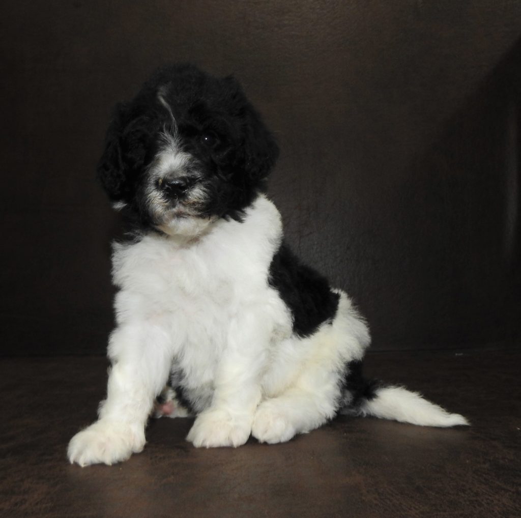 First of all these are temporary pictures until her fall photo shoot!!! We are very excited to add Panda to are Goldendoodle Program. Panda is out of a AKC Brown and white Standard Poodle female and a white creme AKC English Golden Retriever and carries the party gene! She weighs in at aprox. 70 # and has a very soft easy going temperment. Look for her to produce some very high quality F1b non-shedding goldendoodles with flowing black wavy to curly coats with white markings on the chest and toes possible. She is very intelligent and has alot to offer in our breeding program. Look for her puppies to be eyecatchers for sure!!!