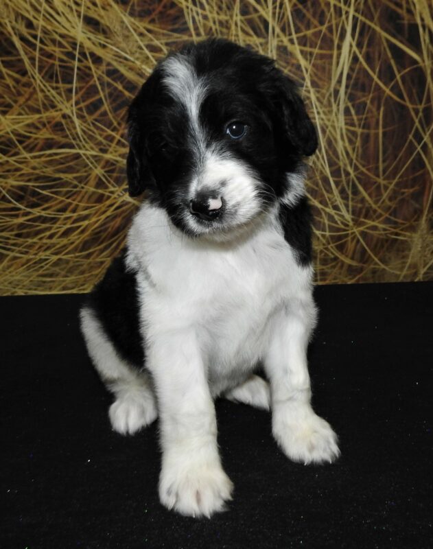 First of all these are temporary pictures until her fall photo shoot!!! We are very excited to add Panda to are Goldendoodle Program. Panda is out of a AKC Brown and white Standard Poodle female and a white creme AKC English Golden Retriever and carries the party gene! She weighs in at aprox. 70 # and has a very soft easy going temperment. Look for her to produce some very high quality F1b non-shedding goldendoodles with flowing black wavy to curly coats with white markings on the chest and toes possible. She is very intelligent and has alot to offer in our breeding program. Look for her puppies to be eyecatchers for sure!!!