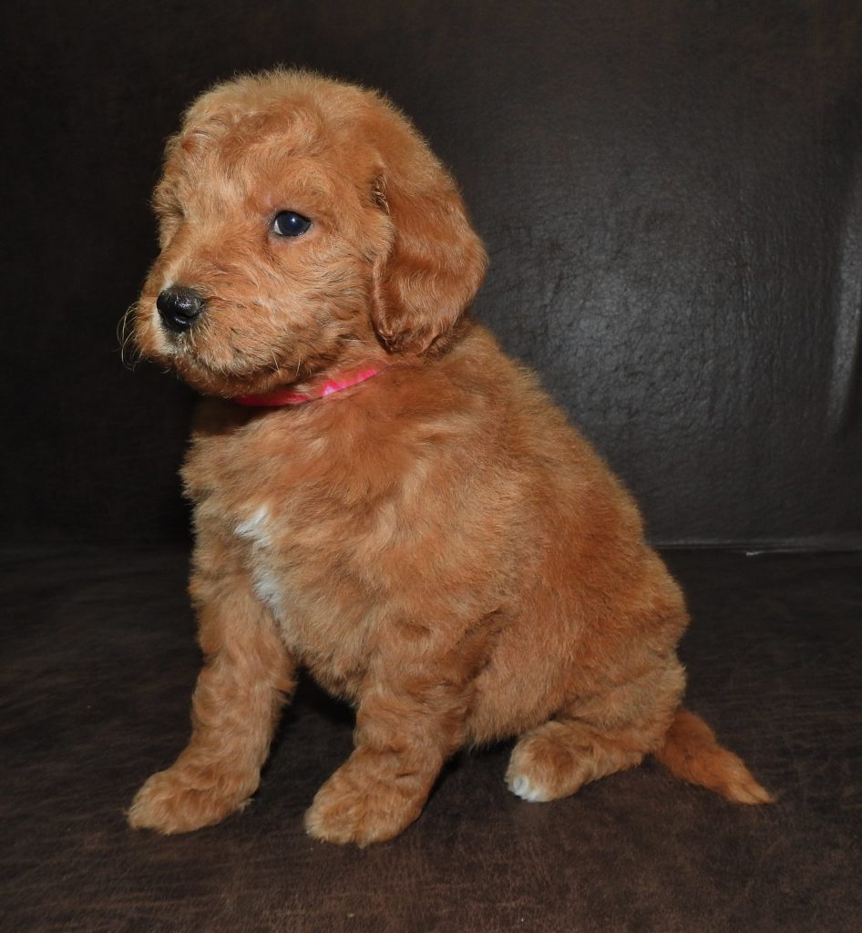Roxie is an F1 English Goldendoodle and a full sister out of the same litter as Luna! We are very excited about this new line of genetics and feel these girls will prove to be an awesome addition to our line-up!! Roxie is between a light apricot and a white creme semi wavy easy flowing coat!! She will produce F1b semi curly to full curly non-shedding coats on her pups!! Look for her pups to be very intelligent awesome looking dogs that draw alot of attention and sport that soft made easy going temperment!! Roxie weighs aprox. 70#.