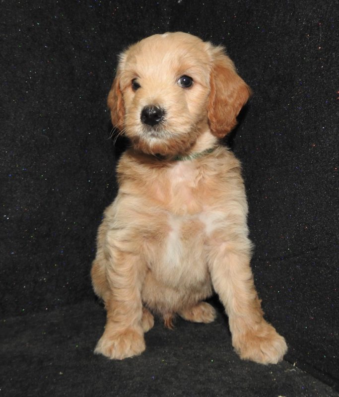 F1b  English Mini Goldendoodle. Mature weight should be 25-45lbs, will sport a semi – curly to curly non shedding coat