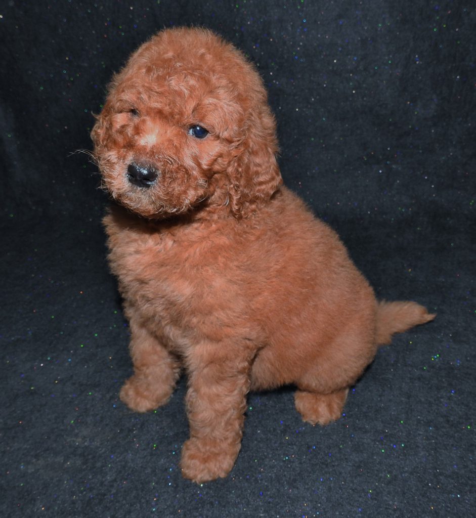 Tucker is an AKC Miniature poodle stud that we are excited about. He sports a Dark Red color with the white socks and chest making him a very sharp looking stud which when bred to select females in our program will create some very awesome looking Goldendoodles and Labradoodles. He is a lover and charms everyone he meets Look for his pups to be highly intelligent, very friendly and be prepared for his pups to draw a lot of attention when out on walks. If your looking for a smaller power packed package take a hard look at Tucker’s pups. Tucker weighs 13#