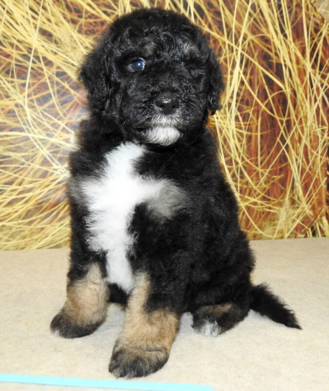 Gander is an AKC miniature poodle that weighs in at 17#. He has an excellent temperament and is very intelligent. Gander should produce litters that are approximately 50% tri-color and 50% blue merle. He has been purchased predominantly for our Bernedoodle program. Look for his puppies to be eyecatchers for sure
