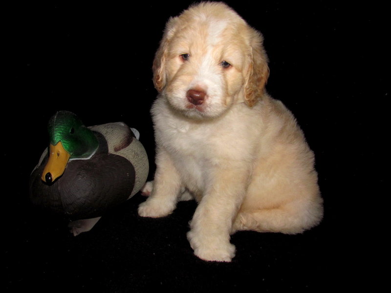Beautiful Creme F1 Labradoodle with a blazed face, this pup is going to mature out with a very curly low to non shedding coat, He has a easy going super temperment!  He will mature out around 75# and should be a fast trainer!!  Make him part of your family today by putting a $200 deposit down along with a puppy application will reserve him for you!!